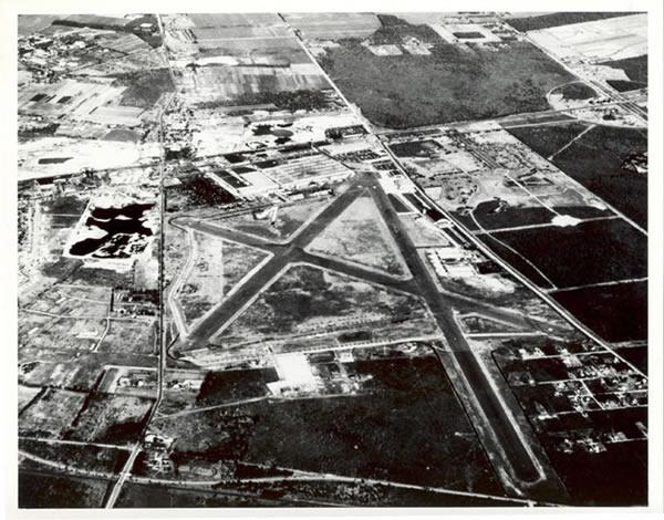 This photo is from February, 1950 and is looking north across the airport. The first thing to notice is Republic Airport used to have three runways.  The third runway ran from the northeast corner of the airport (near New Highway and Conklin Street) to NY Route 110 where  hotels recently opened.