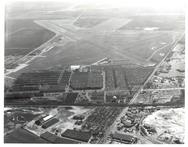 This picture was taken in 1954 and is looking south across the airport. There are some major changes from the 1950 photo to this one. The biggest is that Runway 14-32 was extended and New Highway was relocated to make the bend around the south part of the airport.  Also, the third runway is now closed. Note the planes parked on the former runway on the right side of the photo and the large ‘X’ painted in the center of the runway in the middle of the photo.